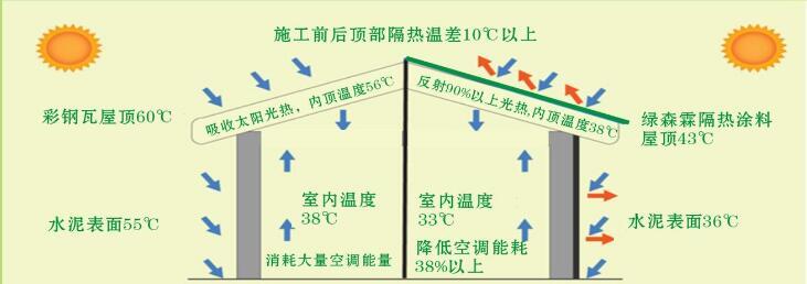 1、隔熱降溫效果好:表面降溫15-25度,室內降溫3-15度,降低空調能耗38%以上,取代傳統隔熱磚、隔熱棉、淋水系統、聚氨酯、SBS卷材等。